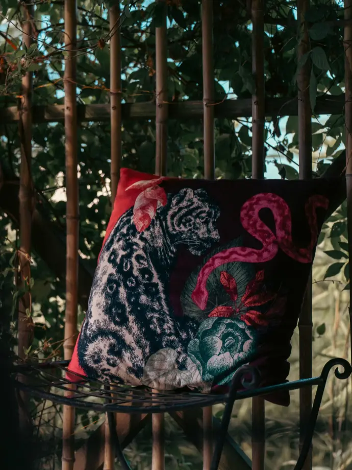 Cette atmosphère enveloppante et mouvante rappelle un refuge naturel, tout comme les coussins en velours, qui, ornés des mêmes motifs végétaux, créent une véritable harmonie.