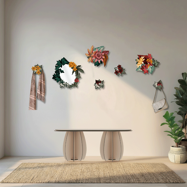 Le grand miroir Boucan, mesurant 80 cm de haut pour 69 cm de large, se place comme pièce centrale. Complété par les patères et porte-manteaux de la collection, chaque élément peut être utilisé seul ou combiné, selon vos envies. Chaque pièce est composée de deux parties : une accroche murale en bois, fixée au mur avec deux vis, et la patère/miroir qui s’insère dans celle-ci. Ce système offre une modularité accrue, permettant de changer les modules entre eux ou de réorganiser le mur selon vos envies.